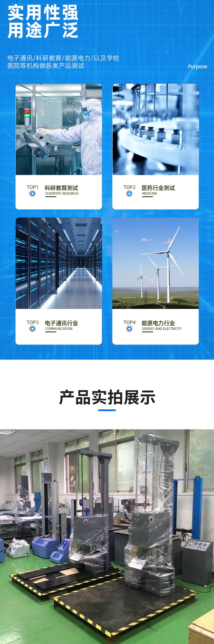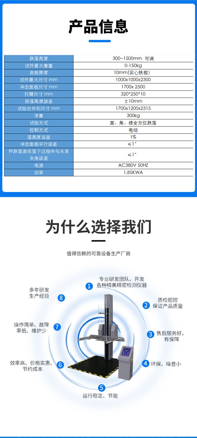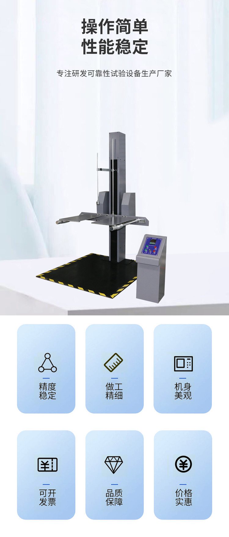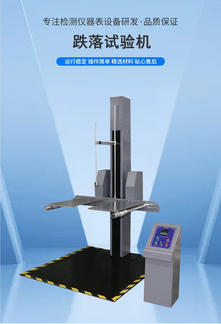 本机专用于测试产品包装受到坠落之受损情况,及评估运输搬运过程时耐冲击强度。可对包装件的面、角、棱作自由跌落试验,配备数显高度显示仪及采用译码器进行高度跟踪,从而能的给出产品跌落高度,与预设跌落高度误差不超过2%或10mm。